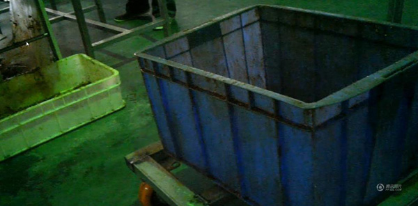 位于河南省通許縣工業(yè)園的開封勁松食品有限公司生產(chǎn)廠房?jī)?nèi),運(yùn)送辣條的藍(lán)色塑料箱上面布滿黑色的污物和油漬(3月7 日攝 視頻截圖)。