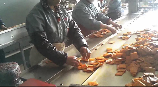 位于河南省通許縣工業(yè)園的開封勁松食品有限公司生產(chǎn)廠房?jī)?nèi),工人直接用手將辣條一塊塊裝入塑料包裝袋(3月7日攝 視頻截圖)。