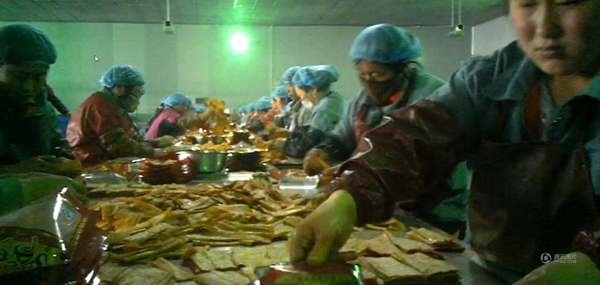 人們不禁擔(dān)心,“辣條”衛(wèi)生嗎?圖為位于河南省通許縣工業(yè)園的開封勁松食品有限公司生產(chǎn)廠房?jī)?nèi),工人直接用手將辣條一塊塊裝入塑料包裝袋(3月7日攝 視頻截圖)。
