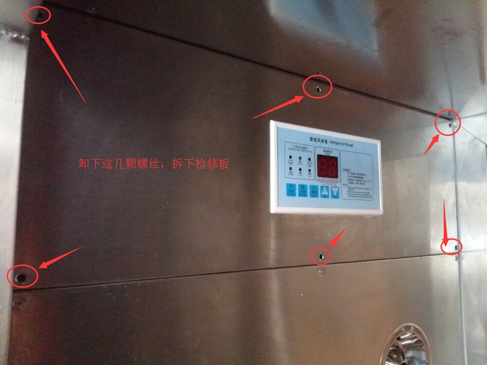下面詳細的談一下整機發(fā)貨的風淋室接電的正確方法之如何區(qū)分火線、地線和靈線:第一步:找到風淋室顯示板,卸下螺絲,拆下檢修板(如下圖);