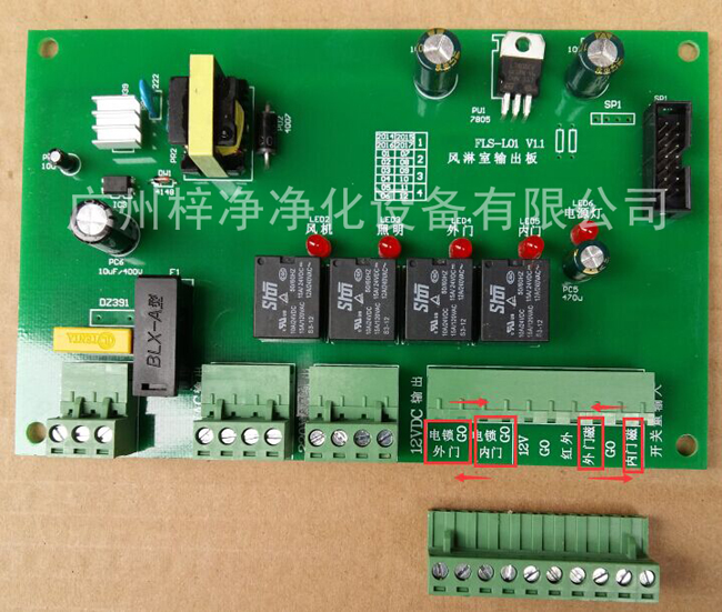 第二種方法:拆開風(fēng)淋室控制器那塊檢修板找到風(fēng)淋室副板如下圖,把風(fēng)淋室的前后門鎖及前后門磁線互換一下就可以了。
