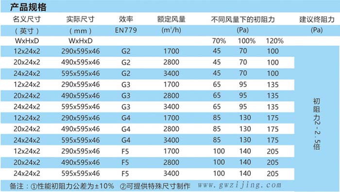 大風(fēng)量初效過濾器尺寸規(guī)格: