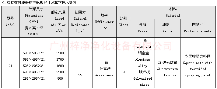G1級(jí)初效過濾器標(biāo)準(zhǔn)規(guī)規(guī)尺寸及其它技術(shù)參數(shù):