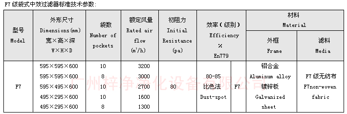 F7級(jí)袋式中效過濾器標(biāo)準(zhǔn)尺寸技術(shù)參數(shù)