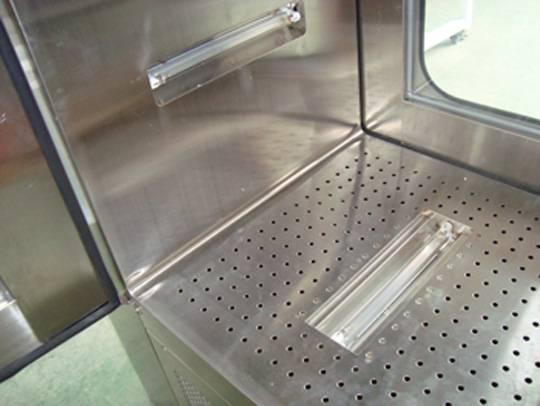 上全不銹鋼層流傳遞窗內(nèi)箱體底部圓孤轉(zhuǎn)角與四周各配一盞紫外殺菌燈。