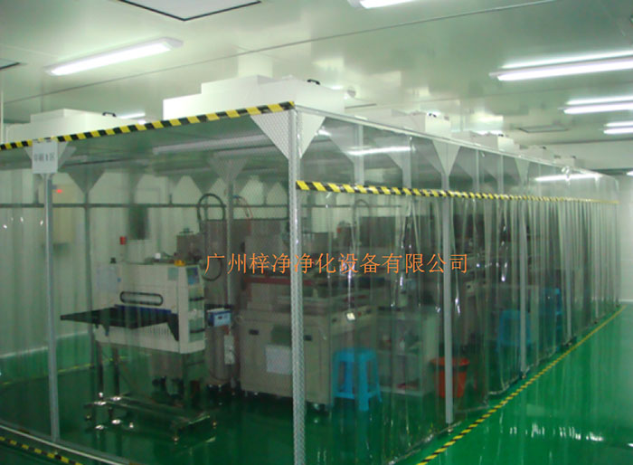 材料以鋼方通噴塑作為框架,采用風機濾網機組FFU送風,凈化棚四周圍用防靜電垂簾,頂部鋪蓋密縫盲板,形成一個密縫區(qū),內部凈化級別可達10—100000級;特別適用于車間內局部凈化級別要求高的區(qū)域,如流水線作業(yè)區(qū)域。高精確度產品組裝區(qū)。